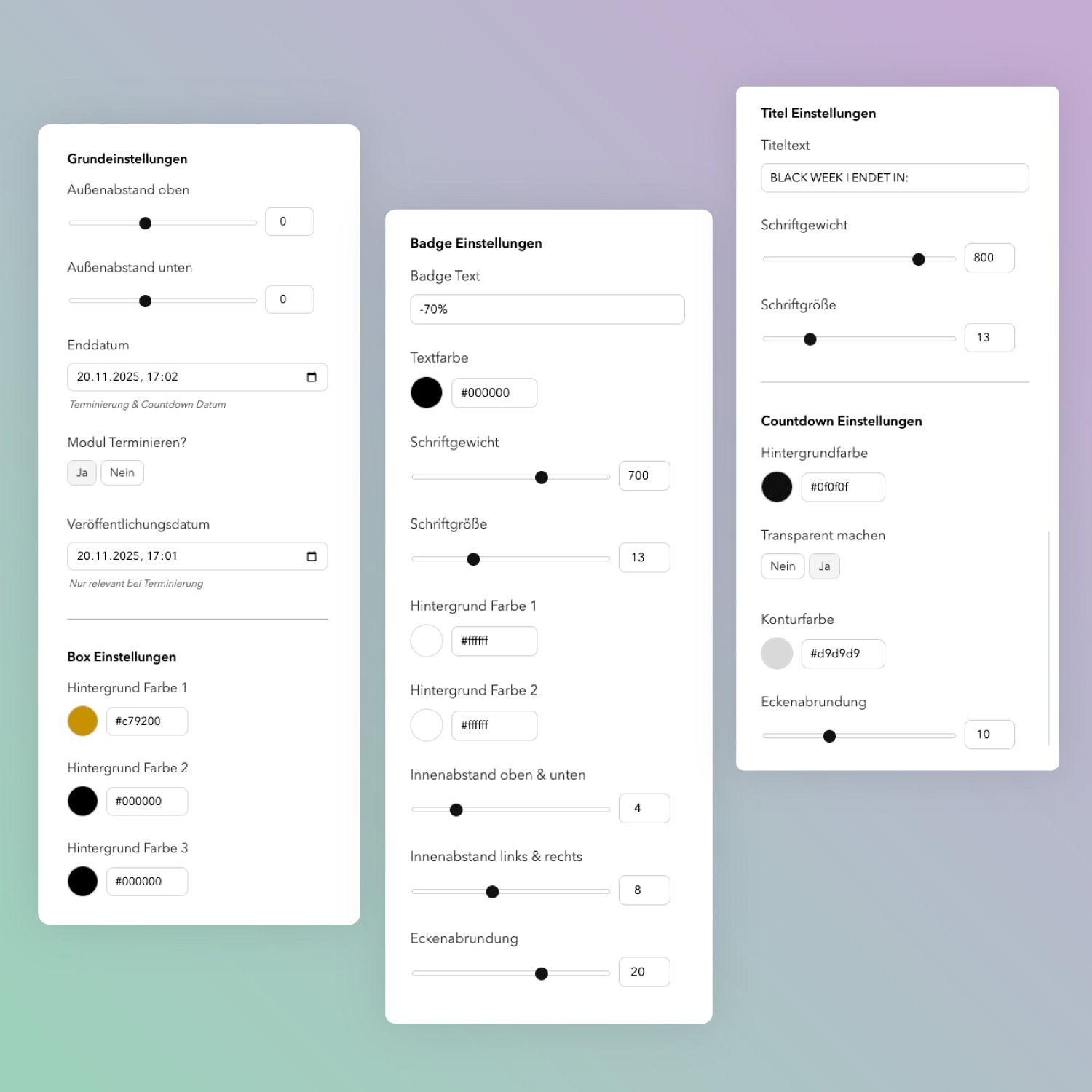 - Maximale Anpassbarkeit: Farben, Größen, Spacing, Badge, Countdown – alles vollständig steuerbar.